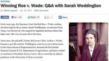 So you'd think that any interview with McCorvey's attorney before the Court, Sarah Weddington, would include at least one question about McCorvey's change of heart. But alas, that wasn't in the cards with TIME magazine's Valerie Lipinski in her January 22 interview with Weddington. Indeed, the entire affair was a succession of softball question after softball question, concluding with a query about whether Weddington ever goes back to listen to audio recordings of her arguments before the Supreme Court (emphasis mine):