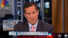 As moderator David Gregory hyped a "feud" over national security between Kentucky Senator Rand Paul and New Jersey Governor Chris Christie on Sunday's NBC Meet the Press, former Senator Rick Santorum called out a stunning media double standard: "...the media has a fascination with how divided the Republican Party is and tends to ignore the divisions within the Democratic Party. And I think they are as very much as real on this issue." [Listen to the audio or watch the video after the jump]