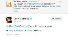 Costello's openly slanted post was the first response to a Huffington Post Tweet on Limbaugh's book. [Update, Thursday, 5:55 pm Eastern: second paragraph corrected, as Costello's Tweet is actually still visible on her timeline.]