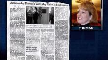 In the report that followed, CBS chief legal correspondent Jan Crawford implied that since Virginia Thomas is the wife of Supreme Court Justice Clarence Thomas her conservative activism in a conflict of interest: "She has long advocated for conservative causes....she formed a grassroots conservative group called Liberty Central and has spoken at tea party conventions....Critics have raised questions about her role in the group as the wife of a sitting Justice, and Mrs. Thomas, not one to suppress her opinions, has felt the heat."