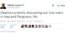 "Obama currently discussing our two wars: in Iraq and Ferguson, Mo," Lowery quipped shortly the beginning of the news conference. Minutes later he tweeted about how the president announced that Attorney General Eric Holder was heading to Ferguson. Apparently bemused by a reply to that tweet, Lowery later retweeted a quip from Glenn Fleishman, "He’d better get there before curfew, I guess." Other prominent African-American journalists who frequently appear on MSNBC used Twitter to register frustration with President Obama, hitting him from the Left. Washington Post's Nia-Malika Henderson tweeted: