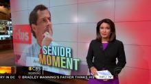 CBS guest anchor Anthony Mason recounted, "Weiner slammed his opponent over age and did so, of all places, at an event sponsored by the AARP." A graphic mocked it as a "senior moment." Mason dismissed Weiner's campaign as a "circus." In the video, Weiner can be seen heatedly talking to George McDonald. [See video below. MP3 audio here.]