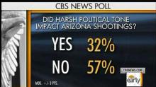 Minutes later, co-host Erica Hill reported on a new CBS News poll on the shooting: "The Sheriff [Clarence Dupnik] investigating the shootings in Arizona has publicly blamed the extreme political rhetoric across this country for the tragedy....A majority of Americans, however, don't necessarily agree that's the case....57% of respondents don't believe the harsh tone had anything to do with the shootings. Just 32% say it did." At the top of the 8:00AM ET hour, news reader Jeff Glor again touted the new poll: "...there's more debate over whether a heated political atmosphere played a role....most Americans reject that idea."