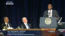 At his keynote speech at the National Prayer Breakfast this morning, world-renowned neurosurgeon Dr. Benjamin Carson laid out some ideas he had for improving health care in the United States of America. Seated to his right was the president of the United States, who appeared to not care much for the good doctor's market-oriented idea of tax-free Health Savings Accounts. [h/t email tipster Brian Plunkett for bringing this to my attention]