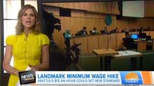 The headline on screen declared: "Landmark Minimum Wage Hike; Seattle's $15 an Hour Could Set New Standard." In a later news brief, Morales proclaimed the policy to be "A historic victory for workers in Seattle that could have a big impact nationwide."