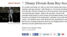 "It's a small world after all, which is why word travels fast when you maintain anti-gay policies," snarked the Daily Beast in a "Cheat Sheet" item this morning celebrating the fact that the entertainment giant -- which, by the way, owns the ABC broadcast network -- has announced it will not give any monies to the Boy Scouts of America in 2015 [see screen capture below page break]: