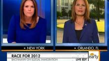 The anchor raised the immigration issue towards the end of her interview of the Minnesota representative. Hill first quoted Gov. Perry's line on the in-state tuition issue from the previous night's debate: "He said, 'If you say we should not educate children who come into our state by no fault of their own, I don't think you have a heart.'" She then made a budget-based appeal to the Republican: "I know you said you don't want any resources to go to illegal aliens or their children. Why not, though, give them a tuition break now, rather then, perhaps, down the line, having to hand over unemployment, or even welfare?"