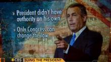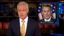 Of the Big Three network newscasts for this evening, only CBS's Evening News covered how Speaker John Boehner's (R-Ohio) threatened lawsuit against President Obama came a step closer to fruition today.