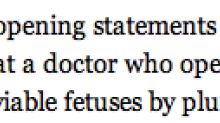In the paper's only story relating to the trial of late-term abortionist Kermit Gosnell on March 19 on Page A17, Jon Hurdle at the New York Times opened (HT Twitchy.com) by telling readers that "In opening statements in court on Monday, prosecutors charged that a doctor who operated a women’s health clinic here killed seven viable fetuses ..." -- not already-born infants.
