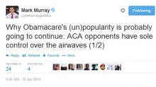 In the first of a series of tweets sent out Tuesday morning, NBC senior political editor Mark Murray complained: "Why ObamaCare's (un)popularity is probably going to continue: ACA opponents have sole control over the airwaves." In a follow-up tweet, Murray cited the Campaign Media Analysis Group: "Per CMAG's Elizabeth Wilner, number of anti-Obamacare commericials since March 31: 32 Number of pro-Obamacare commercials: 0"