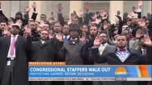 Friday's CBS This Morning and NBC's Today both spotlighted the walk-out protest on Thursday of a group of congressional staffers, who gave the "hands up, don't shoot" gesture of the groups protesting the grand jury's decision in the Michael Brown case. NBC's Tamron Hall trumpeted the "powerful statement without words" on the steps of the U.S. Capitol. CBS's Jeff Glor noted that the participants "stood with their hands in the air." Neither morning show mentioned, however, that the pose forwards an inaccurate portrayal of the Brown shooting.