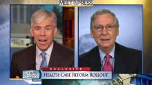 McConnell stood by his opposition: "It's a massive, complicated, unpopular bill. Obviously, if we had the votes, we would repeal it." Gregory ranted: "But, Leader, it's not – but you support the democratic process. This is not a bill. This has been passed; this is the law of the land. You refer to it as a bill. Doesn't that undermine? I mean, if the shoe were on the other foot and it were a law that was passed by Republicans in Congress, would you not refer to it as the law of the land and want to see it implemented as best it could be, despite the fact you disagree with it?"