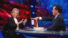 Lo and behold, Hillary Clinton appeared on set, to roars from the studio's liberal audience and chants of “Hillary! Hillary!” Colbert and Clinton proceeded to do an extended back and forth, humorously attempting to one-up each other by name dropping famous celebrities and politicians. [MP3 audio here; video below]