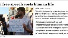 In a September 13 Washington Post On Faith blog post entitled "When free speech costs human life," Qasim Rashid of the Ahmadiyya Muslim Community USA complained that it was "extreme" to expect Muslims in the Middle East to develop thicker skin and not riot every time someone halfway around the world makes a video or cartoon that offends their religious sensibilities: