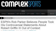 "[J]ust when we were finally starting to forget about those asinine comments [Rob] Parker made about Robert Griffin III on ESPN First Take about a month ago—and just as Parker was about to finish up his 30-day suspension from the Worldwide Leader—he's come out and, in a way, tried to defend what he said once again," Chris Yuscavage of Complex.com reported today.