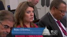 Correspondent Norah O'Donnell confronted Press Secretary Jay Carney during the Tuesday White House press briefing over Dolan's sharp critique of the mandate on the morning newscast: "He [Dolan] said that it's a 'strait-jacketing' and 'handcuffing exemption.'...Is that what the President is doing...strait-jacketing and hand-cuffing religious institutions?" O'Donnell's question didn't make it on the air on Tuesday's CBS Evening News or Wednesday's CBS This Morning, even after Carney evaded directly answering her question.