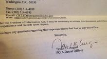 Former NewsBuster Lachlan Markay, who now does excellent work at the Washington Free Beacon, tweeted a link to a stunning photo of a Freedom of Information Act (FOIA) request denial letter sent from one Taylor D. August, a "FOIA Denial Officer" at the Department of Education to Morgan Smith of the Texas Tribune. "Here's to transparency in job titles! #foia," Smith tweeted from her account at 4:20 p.m. Eastern today.