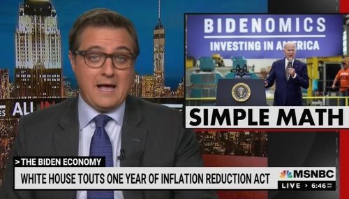 On MSNBC's All In, host Chris Hayes took a break from incessantly covering former President Donald Trump and his legal woes to mark the one-year anniversary of the passage of the so-called Inflation Reduction Act. During this commemoration, Hayes urged Democrats to run on their record of over three percent inflation in the upcoming 2024 presidential and congressional elections. Hayes…