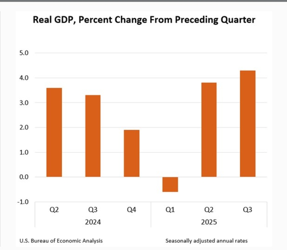 Real gross domestic product (GDP) increased at an annual rate of 4.3% in the third quarter of 2025 – the highest rate since it grew 4.7% in the third quarter of 2023 – according to the initial estimate released Tuesday by the U.S. Bureau of Economic Analysis (BEA).