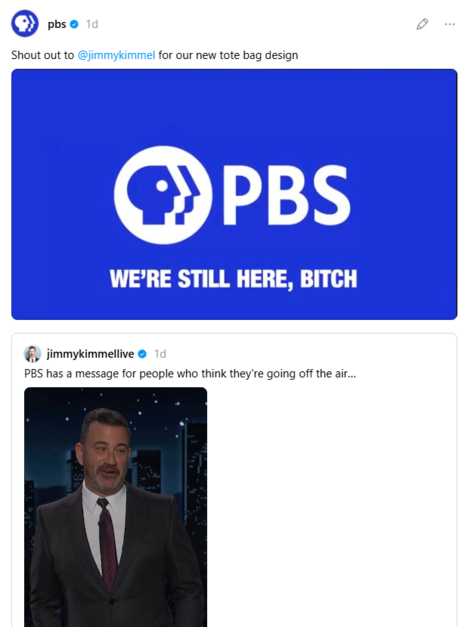 News Hour anchor Amna Nawaz approved and replied with “Nailed it” and a bullseye emoji, but the main PBS account suggested there could be new merchandise to be sold, “Shout out to @jimmykimmel for our new tote bag design,” followed by a picture of the PBS logo and the tagline “we’re still here, bitch.”