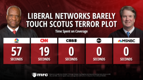 MRC analysts found that from October 5 through October 9, not one of the left-wing TV news networks gave last Sunday’s foiled Red Mass bombing even a full minute of coverage. NBC was the only broadcast network that even mentioned the incident on one of its flagship morning or evening news programs. It wasn’t until October 8, four days after the foiled plot, that NBC Nightly News finally aired a 57-second report about it.