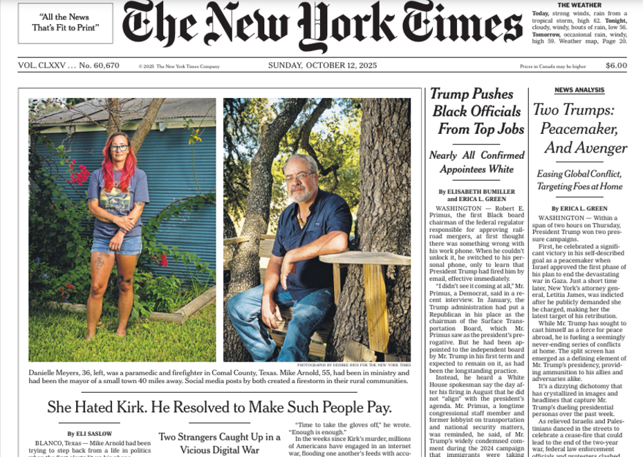 Reporter-at-large Eli Saslow journeyed to Texas Hill Country for the latest epic, a 3,000-word sob story about a fired female firefighter, that got major, three-column play across the prime news real estate of Sunday’s front page: “She Hated Kirk. He Resolved to Make Such People Pay.”