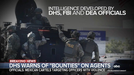 Chief Justice correspondent Pierre Thomas had the breakdown of DHS telling reporters “they’re seeing intelligence that Mexican cartels are attempting to track, harass, and target immigration and Border Patrol agents with violence” with rewards of “up to $50,000 for the assassination of high ranking officials”: