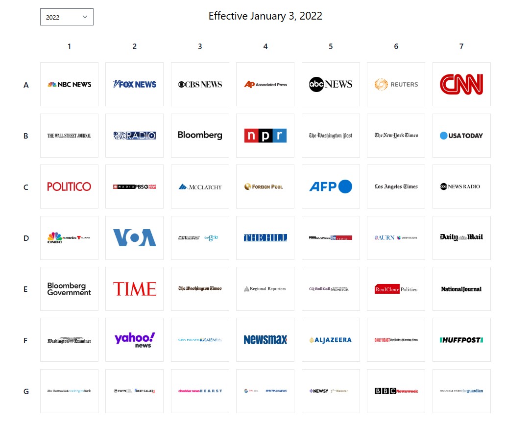 As such, row two will now read, going the same direction: AFP, Wall Street Journal, Bloomberg, NPR, The Washington Post, The New York Times, and USA Today.