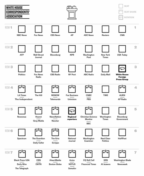 By row three is when the real deck shuffling begins as it will now read: Politico, Fox News Radio, CBS News Radio, New York Post, ABC News Radio, Daily Mail, and White House Foreign Press Group.