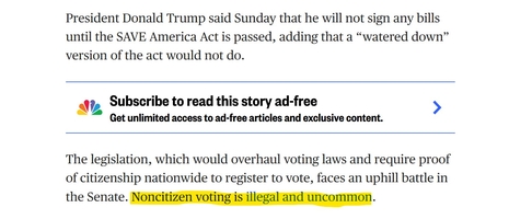 On March 9, Yahoo News featured an NBC News write-up about Trump vowing to block legislation until the SAVE America Act is passed. NBC News’s bias was evident from the start, warning readers in the second paragraph that “Noncitizen voting is illegal and uncommon.”