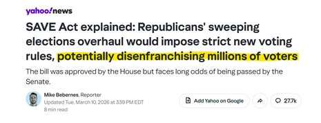 Yahoo News did include the SAVE America Act in its promoted coverage, but only twice out of the 60 stories featured in its top 20 morning listings during the March 8–10 review period.