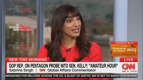 CNN ran crisis comms for Senator Mark Kelly (D-Ariz.) on Tuesday’s Situation Room after the Department of War opened an investigation into his part of the "illegal orders" video. Co-host Pamela Brown and global affairs commentator Sabrina Singh never closely scrutinized Kelly or provided a differing perspective to balance their analysis.