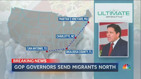 7:01:43 p.m. EasternLESTER HOLT: Good evening, everyone. The nation's migrant crisis landing at an unfamiliar doorstep tonight nearby 50 Venezuelan migrants flown from Texas at the direction of Florida's Republican Governor to a Democratic enclave in Massachusetts. Their arrival at Martha's Vineyard captured in this video provided by Governor Ron DeSantis's office from a source on the ground.