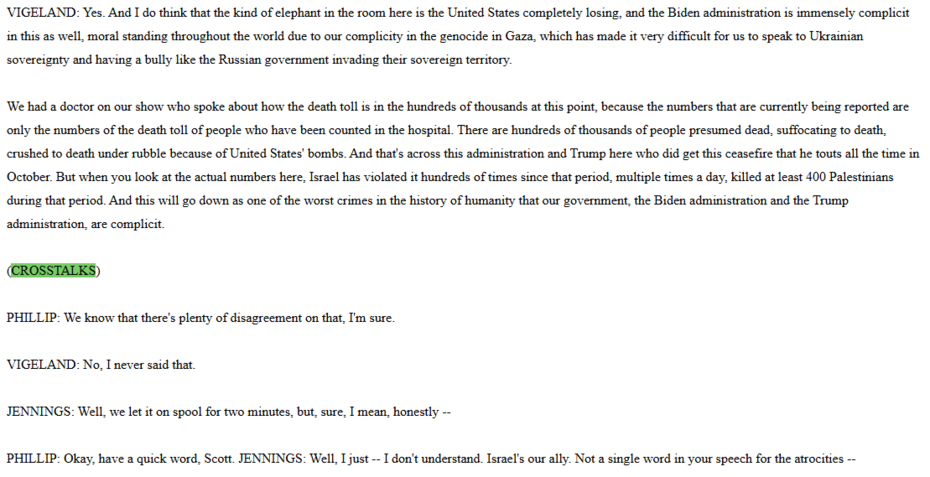 Citing some unnamed doctor she supposedly had on her show, and who’s credentials she didn’t share with the CNN panel, Vigeland claimed the already overly inflated death toll number provided by Hamas may actually be higher. “And this will go down as one of the worst crimes in the history of humanity that our government, the Biden administration and the Trump administration, are complicit in,” she whined.