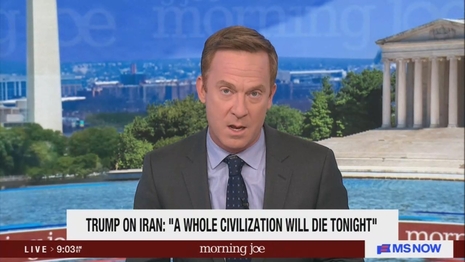 In a continued meltdown after President Trump’s press conference and continuous Truth Social posts, Tuesday’s Morning Joe on MS NOW continuously claimed Trump was about to commit war crimes in Iran, except for newly signed MS NOW analyst John Kirby, who acted as a voice of reason as he put trust in military leaders instead. Even after Kirby’s moment, during the 9 a.m. hour, co-host Jonathan Lemire called Trump “genocidal” as guests Andrew Ross Sorkin and Eugene Robinson said the U.S. will become a villain.