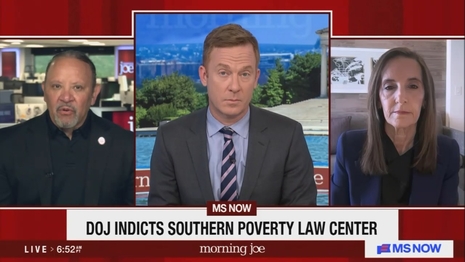 Just about an hour before the segment, MS NOW and Morning Joe aired a 2-minute-long ad, which asked for donations to the SPLC for “$19 a month” for a “special Fight Hate t-shirt.” Essentially, amid the criminal indictments, MS NOW was still taking money from the SPLC.