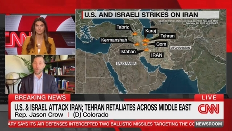CNN anchor Kaitlan Collins interviewed Rep. Jason Crow (D-Colo.), one of the six Democrats to make a video encouraging military service members to disobey unlawful orders, although they couldn't define any. She underlined for viewers that Crow was a former paratrooper and Army Ranger. Crow had been on her show The Source, the night before, and spoke out strongly against any action against Iran, so she knew exactly where he stood when she asked, "What is your reaction to what you've seen play out so far?"