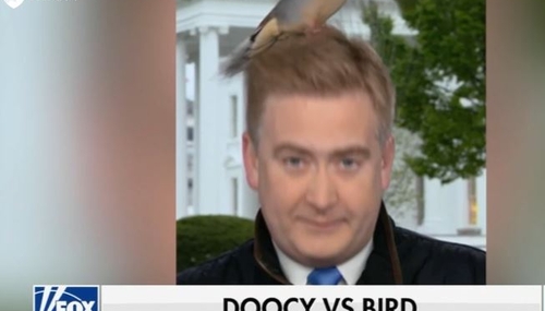 As Fox News Channel’s Peter Doocy was reporting live from the White House Friday morning, a bird swooped down and landed on his head, prompting Doocy to call on Pres. Trump to take action.