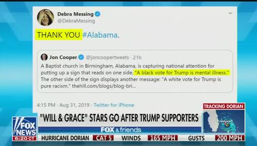 Will and Grace actress Debra Messing tweeted support for an Alabama Baptist church this weekend but not because she had some sudden religious awakening. Instead, Messing agreed with the liberal church’s provocative sign which called black Trump voters “mentally ill.”