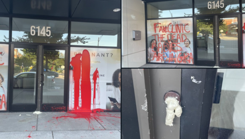 Volunteers at Chicago's Catholic pregnancy center, Aid for Women, discovered their facility vandalized with cemented doors and graffiti stating "FAKE CLINIC" and "THE DEAD BABIES ARE IN GAZA."