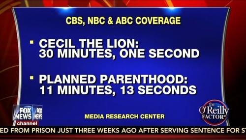 For the second time in a week, Fox News Channel (FNC) host Bill O’Reilly turned to statistics from the “very accurate” Media Research Center to form the basis of a segment of The O’Reilly Factor concerning the major broadcast network coverage of the Planned Parenthood scandal with Thursday’s mention comparing it with the droves of coverage given to the shooting death of Cecil the lion in Zimbabwe…