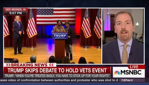 While Thursday night’s GOP debate was still on-going, NBC’s Meet the Press moderator Chuck Todd appeared on MSNBC’s The Last Word and hyped that Donald Trump events like the one he held instead of attending the debate have a “sort of like this rock concert feel” while the latest Republican presidential debate felt like it was “low energy” instead.