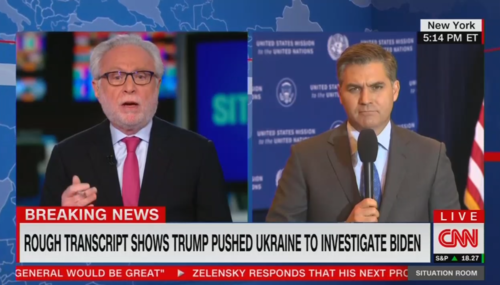 Moments after President Trump’s Wednesday press conference before a hostile press itching for his impeachment, CNN’s The Situation Room host Wolf Blitzer and chief White House correspondent Jim Acosta preyed on the fact that most people had not read the transcript of the phone call between Trump and the president of Ukraine and blatantly lied about the “favor” Trump asked for.