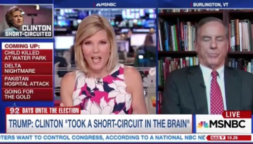 While a guest on Monday's MSNBC Live program, former Vermont Governor Howard Dean could barely control his anger when host Kate Snow asked: “Donald Trump is zeroing in” on Hillary Clinton's “use of the term 'short-circuited.' Why is she struggling to answer those questions about her e-mail?”