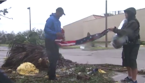 As Hurricane Harvey battered the coast of Texas over the weekend, it was estimated that the storm could cost as much, if not more, than $40 billion worth of damages, with at least one death being attributed to the storm. But there was a touching moment after Harvey’s landfall on Saturday as Paul Goodloe, a meteorologist for The Weather Channel, discovered a downed American flag outside a school…
