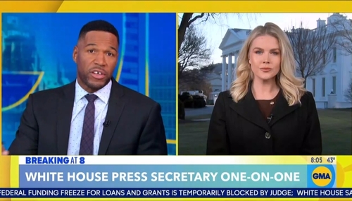 For her first broadcast network interview since officially taking office as White House Press Secretary, Karoline Leavitt ventured into the far-left yet superficial lair of ABC’s Good Morning America, but drew the easiest choice of co-host in former NFL player Michael Strahan as opposed to George Stephanopoulos, who served in her position during the Clinton administration.