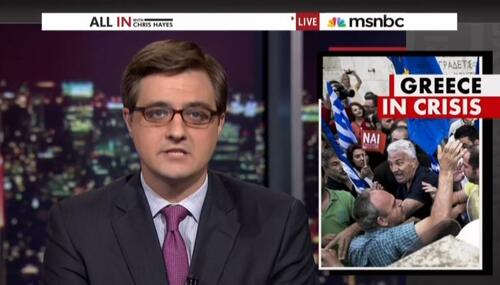 MSNBC host Chris Hayes devoted a segment during Monday’s All In to commenting on the financial crisis in Greece and chose not to attack the left-wing government or any of the previous governments for their spending habits, but rather laid blame at the feet of “morally monstrous” European banks and others in the Eurozone for grinding “Greece into misery” in “a sadistic exercise in sheer will to…