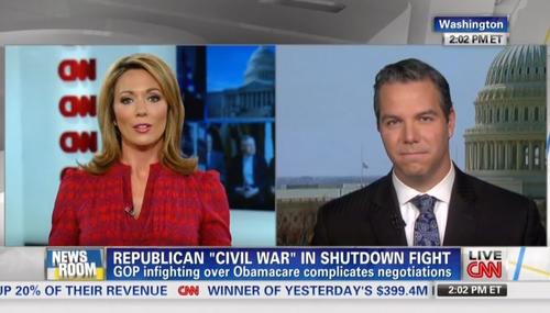 On Wednesday's CBS Evening News and Thursday's CBS This Morning, Nancy Cordes repeatedly played up how an unidentified Republican in the U.S. Senate attacked a House proposal to de-fund ObamaCare as "suicide". Cordes underlined that "Speaker Boehner was forced into the risky strategy by his right flank", and wondered if the plan was "just a recipe for a government shutdown".