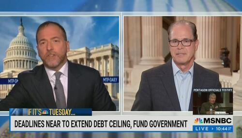 On Tuesday's MTP Daily on MSNBC, host Chuck Todd battled Indiana Sen. Mike Braun over the GOP's refusal to assist the Democrats in passing their agenda by raising the debt ceiling. According to Todd, the GOP have been playing "Russian Roulette" and threatening to "punish the American economy" with an "absurd" "game of chicken."