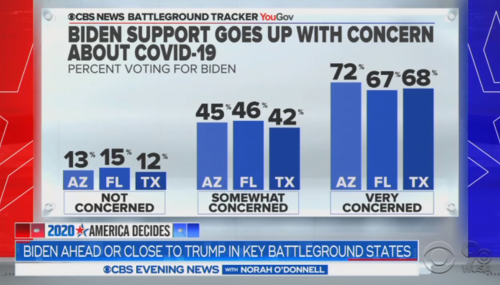 It seems as though CBS News finally got their months-old wish – to have coronavirus “infect” President Trump’s reelection chances – granted, according to their new 2020 battleground tracker poll. As anchor Norah O’Donnell morbidly celebrated during Monday’s edition of CBS Evening News, “The pandemic is reshaping the presidential race!”